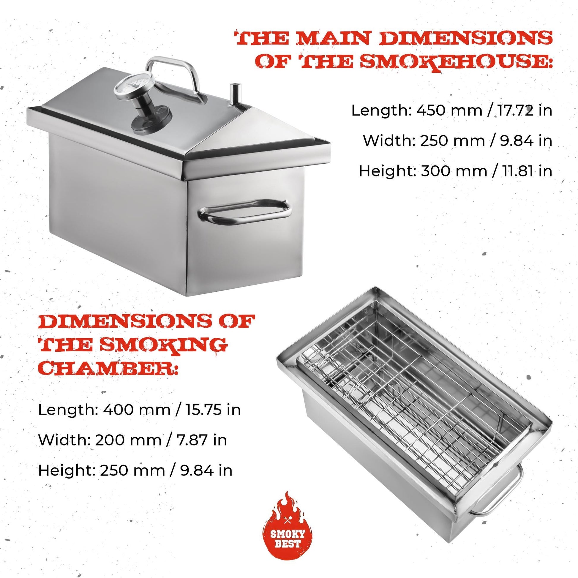 🔥 Compact smoker with water seal, ideal for meat, fish or vegetables, this smoker offers rich, smoky flavours in a small and efficient design. 🐟🍖🍆 Made from stainless steel (AISI 430, 1.5mm thick), this smoker is durable, corrosion-resistant and provides a long service life. The grates are made from high-quality AISI 304 stainless steel, ensuring food safety and easy cleaning after each use. Equipped with a water seal and an attachable smoke exhaust hose, this smoker provides safe and convenient indoor smoking - simply direct the smoke through the window. Also visit our store for a wide selection of smokers and fire cooking equipment: https://www.etsy.com/shop/smokybest 📏 Technical details: • External dimensions: 17.7×9.8×11.8 inches (450×250×300 mm) • Smoke chamber: 15.7×7.9×9.8 inches (400×200×250 mm) • Capacity: Up to 3-4 kg of food per load (6.6-8.8 lbs) • Weight: 7.5 kg (16.5 lbs) • Material: Stainless steel (AISI 430, 1.5 mm thickness) • Heat sources: Compatible with grills, electric stoves, etc. • Compact size: Ideal for small kitchens, patios or camping sites. • Safe for indoor use: The airlock and exhaust hose make indoor smoking easy and convenient • Versatility: Easily smoke meat, fish, vegetables and more • A great gift idea for food lovers If you have any questions, feel free to contact us.